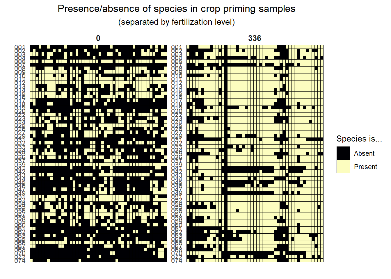 amoA_presence_absence %>%rownames_to_column(var ="sample_id") %>%pivot_longer(cols = amoA.001:amoA.074, names_to ="amoA", values_to ="presence") %>%mutate(amoA =str_sub(amoA, -3),presence =as.factor(presence)) %>%left_join(metadata %>%rownames_to_column(var ="sample_id")) %>%ggplot(aes(sample_id, amoA, fill = presence)) +geom_tile(color ="black") +labs(x ="",y ="",fill ="Species is...",title ="Presence/absence of species in crop priming samples",subtitle ="(separated by fertilization level)" ) +# scale_fill_manual(values = pa_cols)scale_fill_viridis_d(labels =c("Absent", "Present"),begin =0, end =1,option ="magma") +theme(axis.text.x =element_blank(),plot.title =element_text(hjust =0.5),plot.subtitle =element_text(hjust =0.5),# strip.background = element_rect(color = "black", fill = "NA", size = 1),strip.text =element_text(size =10, face ="bold") ) +scale_y_discrete(limits = rev) +facet_wrap(~ fert_level, scales ="free")